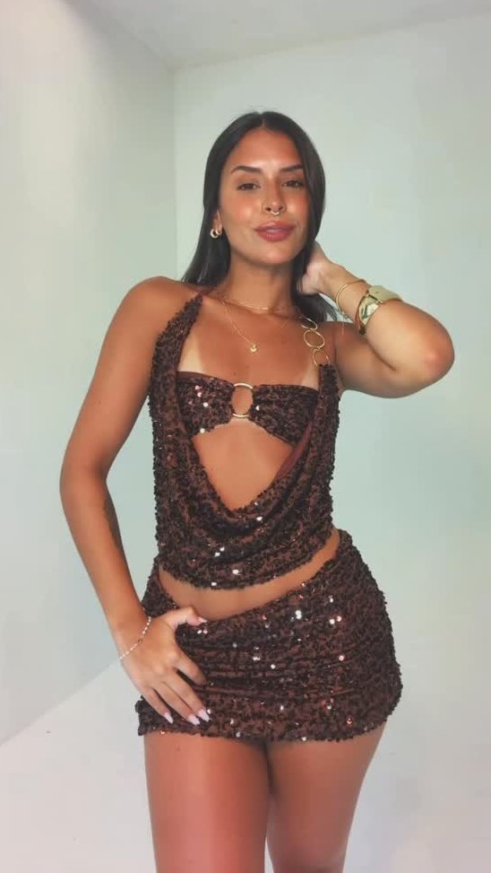 Party Style Dark Coffee Sequin Halterneck Cutout Crop Top + Mini Skirt Set