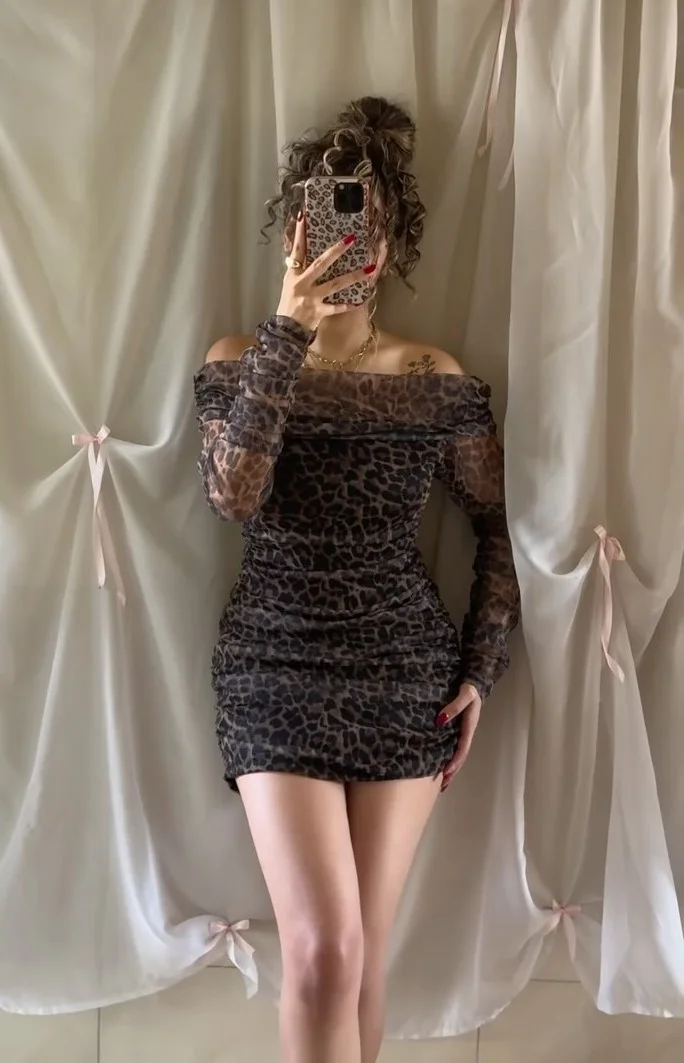 Sexy off-the-Shoulder off-the-Shoulder Leopard Print Mini Skirt