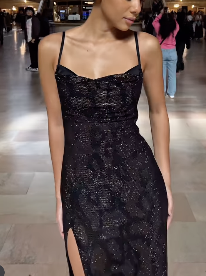This is a stunning black maxi dress. It features thin spaghetti straps and a sweetheart neckline, which beautifully accentuates the collarbone and shoulder line. The dress is adorned with shimmering sequins all over, adding a touch of glamour and making it perfect for special occasions. A high side slit not only enhances the dress's elegance but also allows for ease of movement and shows off a bit of leg, adding a sexy and stylish element.