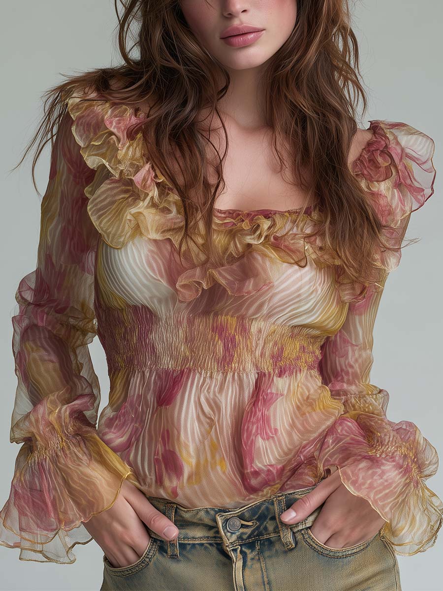 Vintage Elegance Romantic Boho Ruffled Floral Chiffon Top