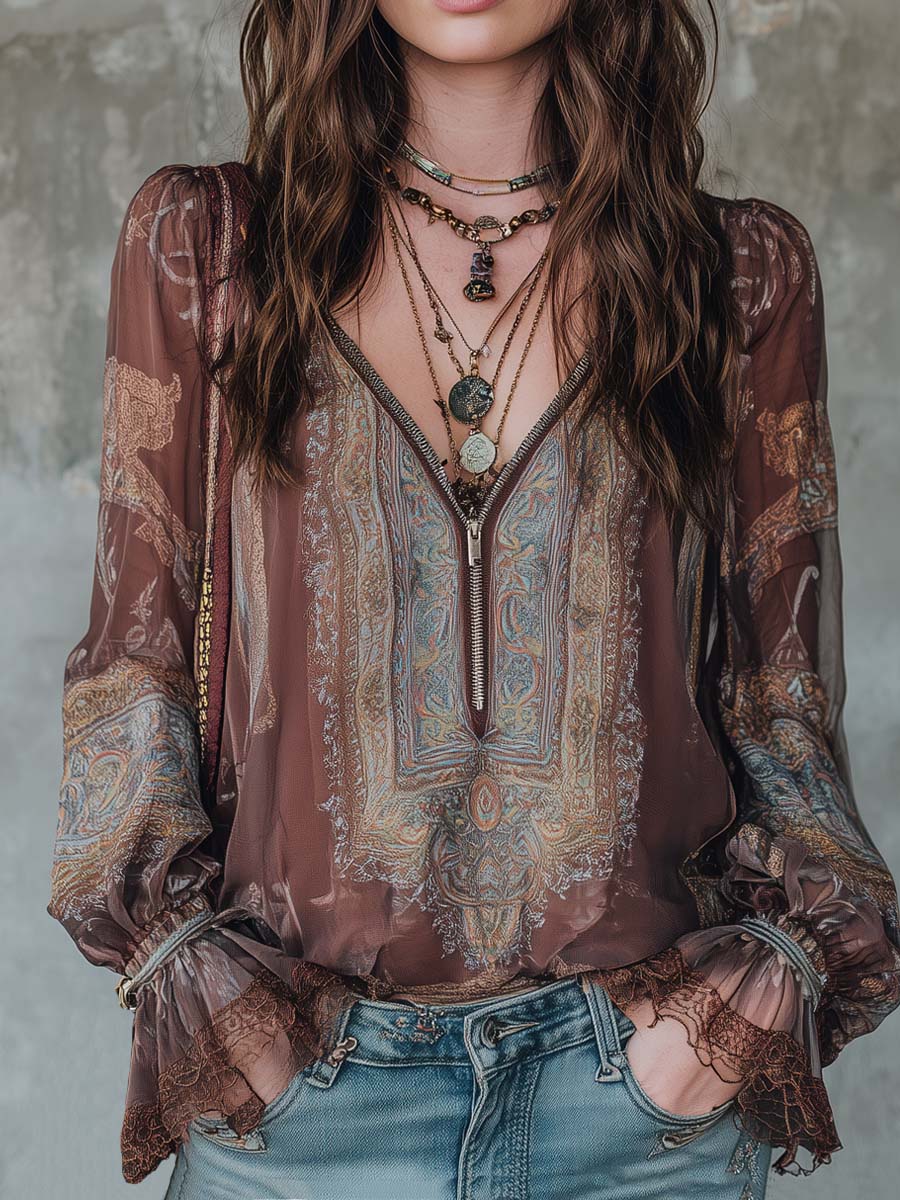 Vintage Ethnic Style Floral Lace Cuffs Blouse